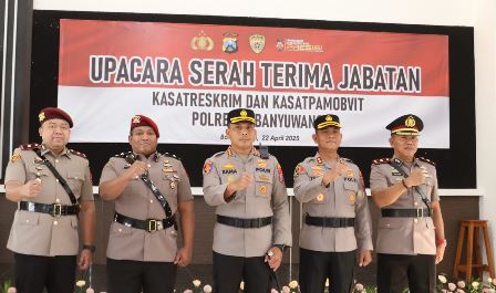 BANYUWANGI – Polresta Banyuwangi menggelar upacara serah terima jabatan sejumlah pejabat, Senin (22/04/2025) pagi, bertempat di Gedung Rupatama Wira Pratama Polresta Banyuwangi.